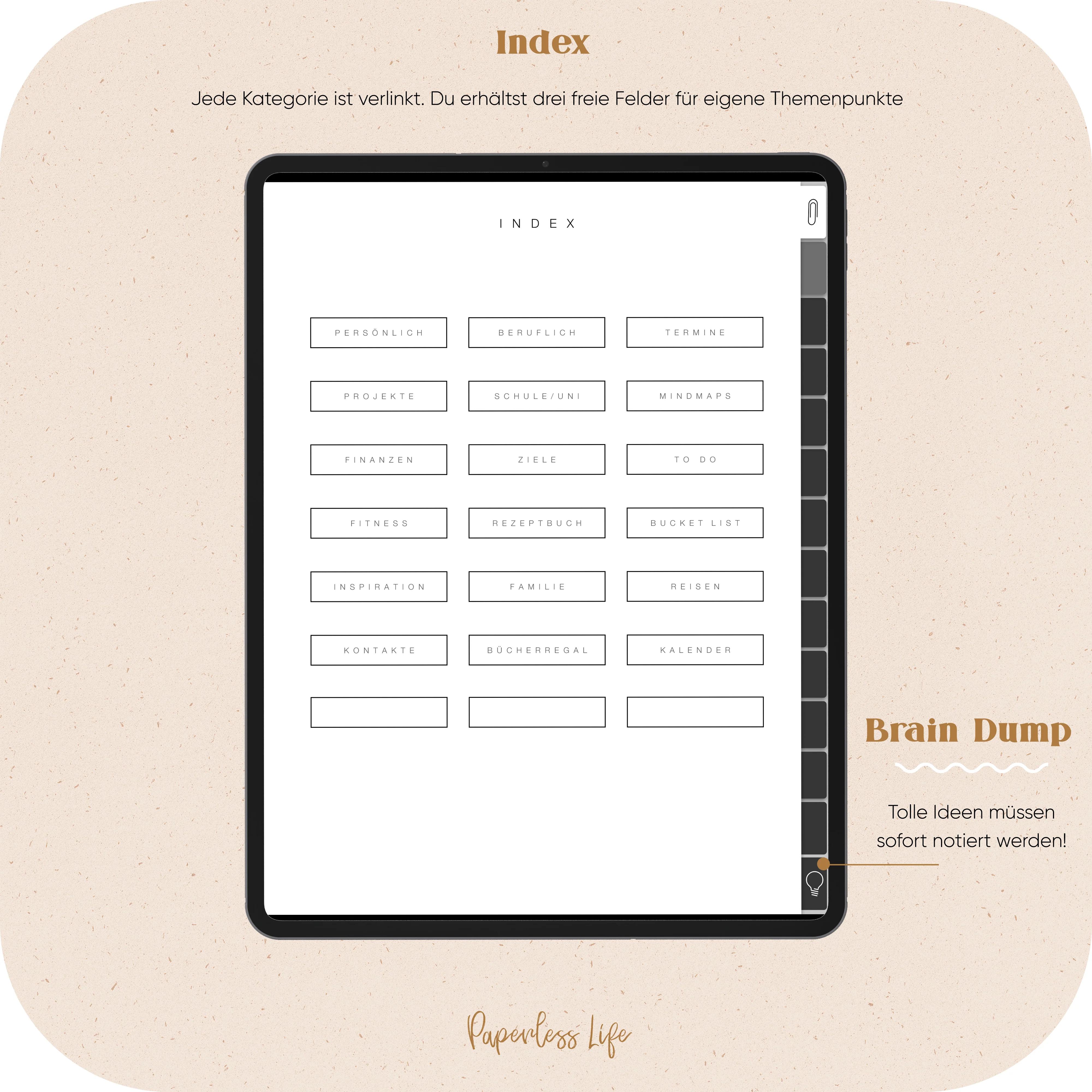 Index: verlinkte Hauptkategorien mit jeweils 10 Unterkategorien: Persönlich, Beruflich, Termine, Projekte, Schule/Uni, Mindmaps, Finanzen, Ziele, To Do, Fitness, Rezeptbuch, Bucket List, Inspiration, Familie, Reisen, Kontakte, Bücherregal, Kalender, 3 freie Kategorien für deine Themen