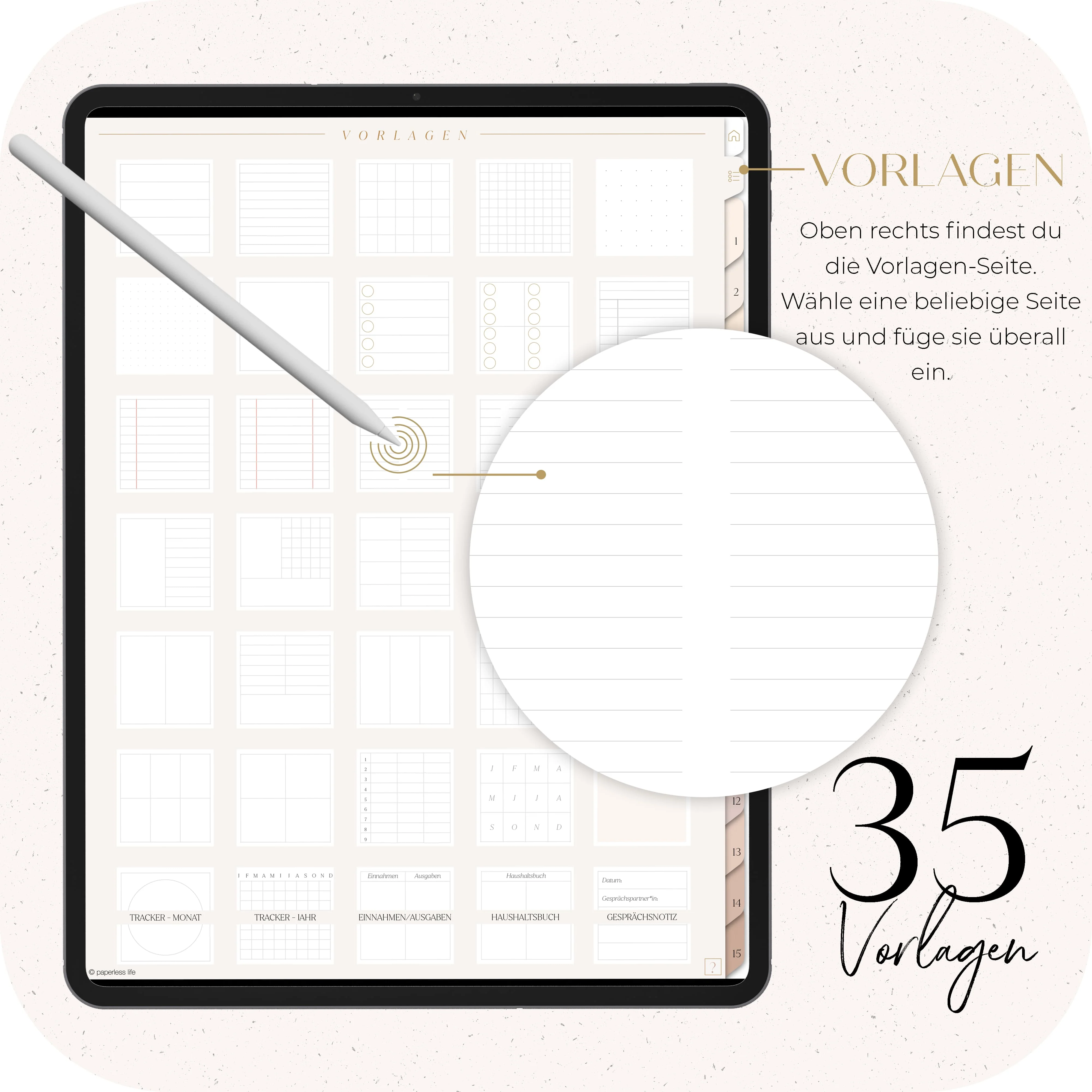 Dieses digitale Notizbuch ist perfekt fĂĽr dein iPad oder Tablet geeignet und funktioniert mit allen gängigen Notizen-Apps. Mit 15 Registerseiten und 35 Vorlagen kannst du es individuell nach deinen BedĂĽrfnissen gestalten. Â